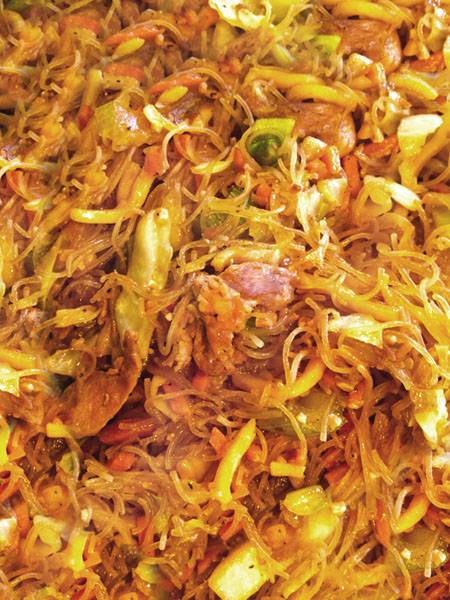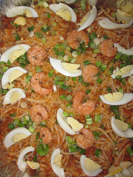 Rice noodles topped with Egg, Shrimp and Chicharon in a light sauce.