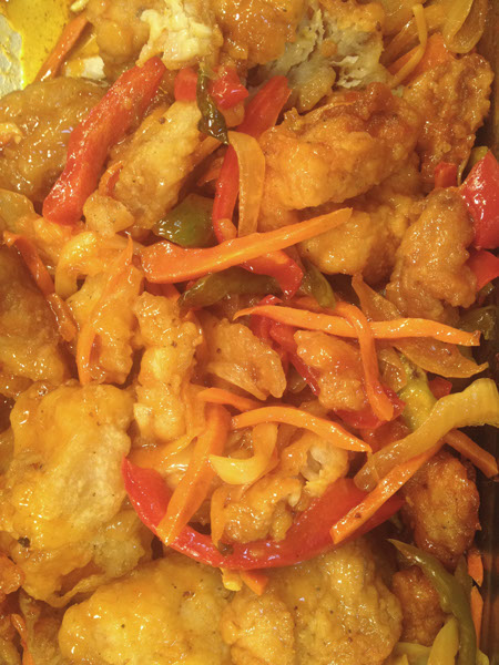 Deep Fried Fillet White Fish chunks in Sweet and Sour sauce with Ginger Onions, Red and Green Bell Peppers.