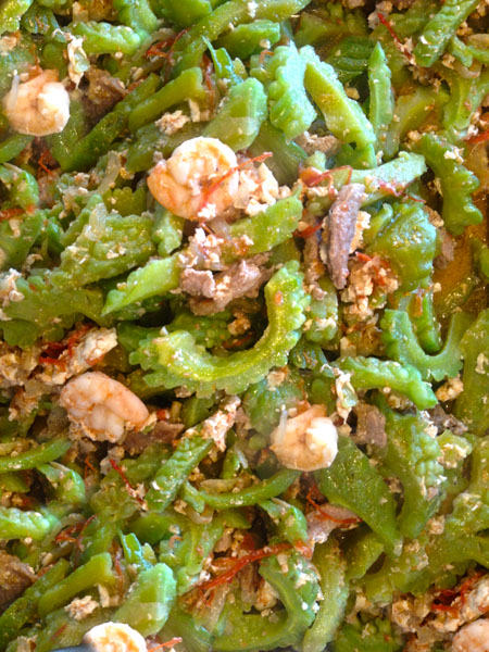 Bitter Melon sautéed in Pork slices, Shrimps, Onions, Tomatoes, Egg, Garlic and Tomatoes.
