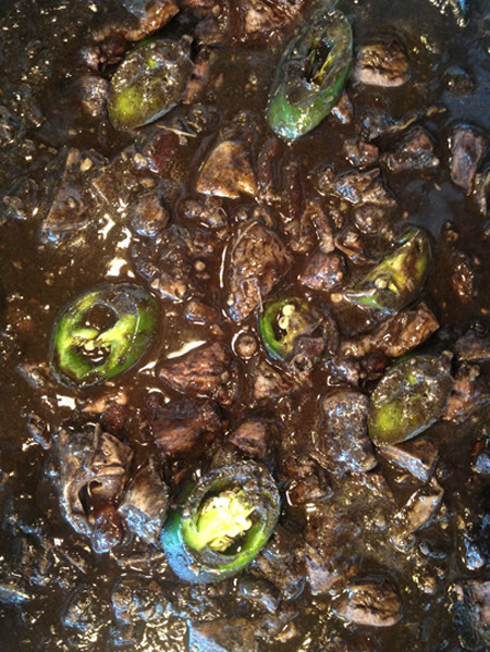 Chopped Pork Liver and Meat cooked in Spicy Sauce with Daikon and Chili slices.