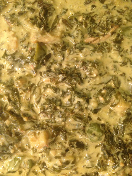 Thin slices of Fresh Taro Leaves, simmered in Coconut Milk, Salted Shrimps, Pork bits, Chili and Spices.